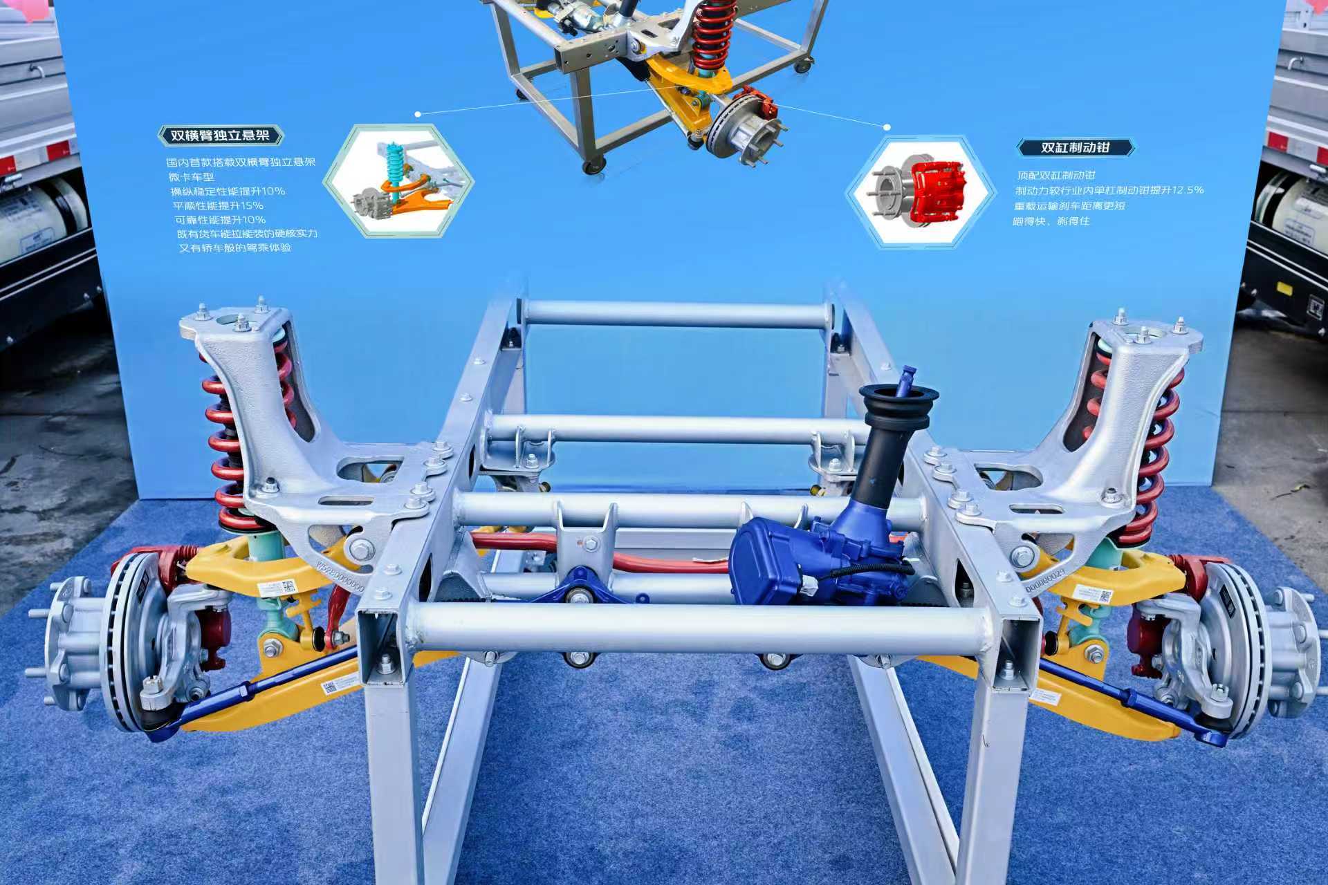 在操控与安全方面,产品首次采用双横臂独立悬架与P-EPS电动助力转向系统,兼顾操控灵活性与行驶稳定性。行业首创的双缸制动钳,提升了山区长下坡等复杂路况下的制动效能。配合直通式高强钢大梁、加强型大速比后桥和5+2加强型板簧,提升起步动力性的同时,确保了重载工况下的车身强度与货物安全。此外,车辆配备的ESC+TCS+HAS+HBA+EPB+Autohold+AEB等主动安全配置和照射距离较普通微卡提升60%的LED大灯,全方位、全天候为卡友保驾护航。